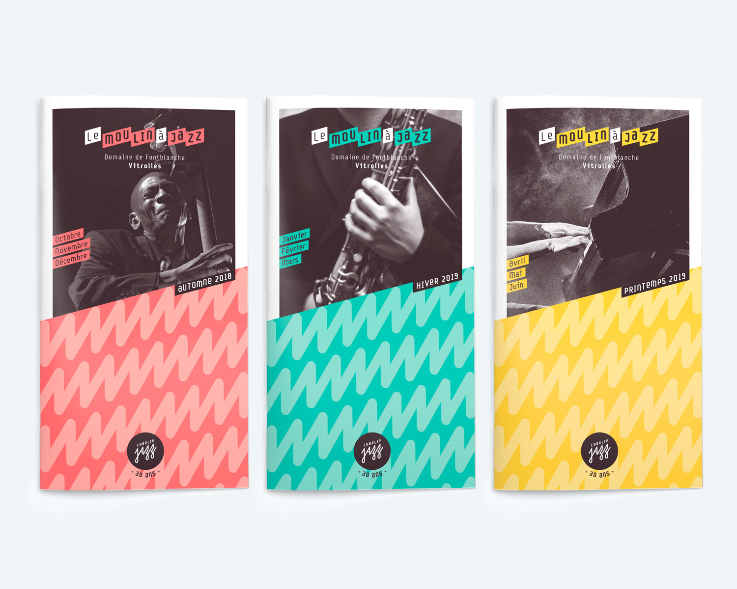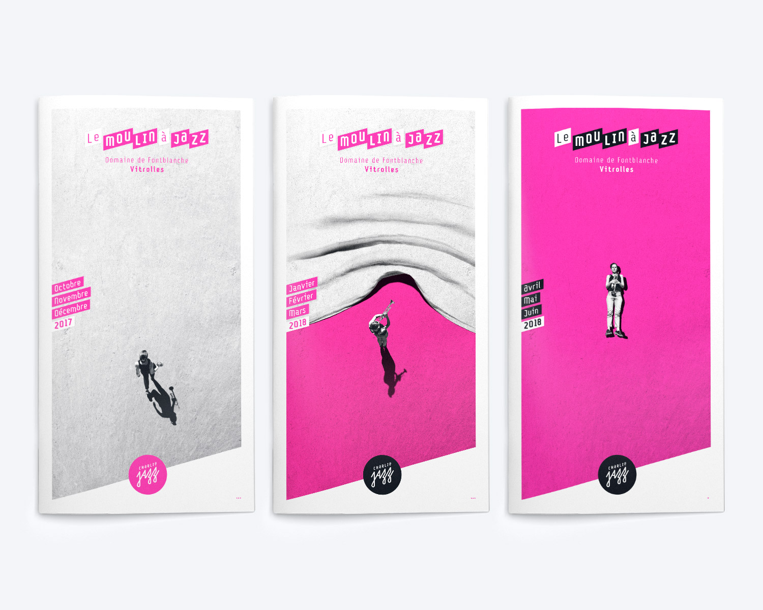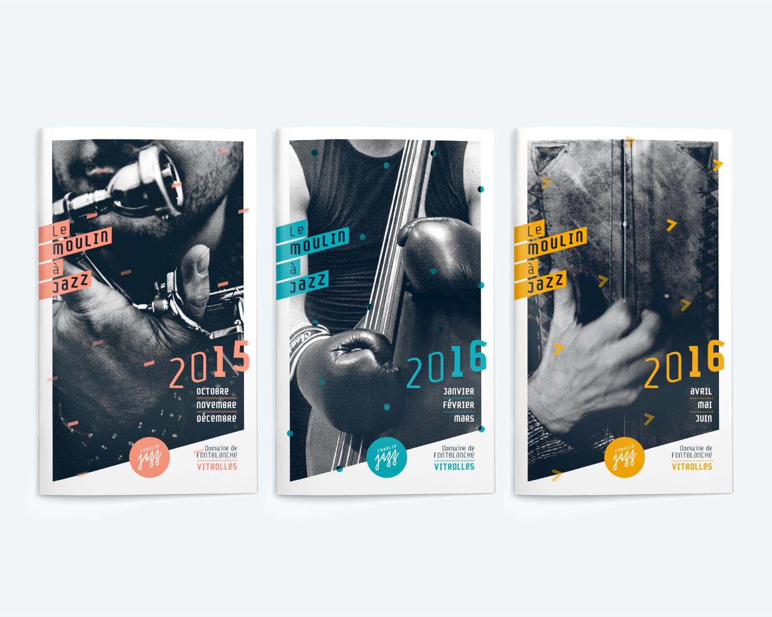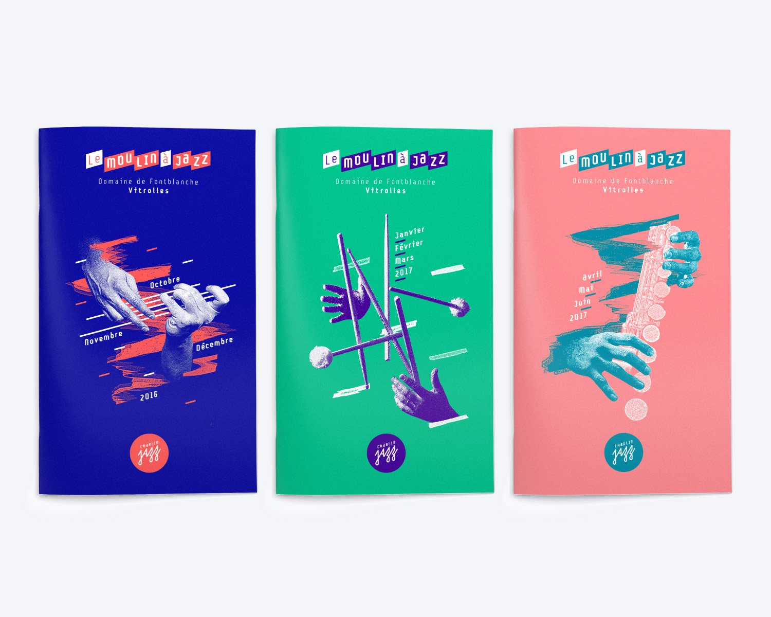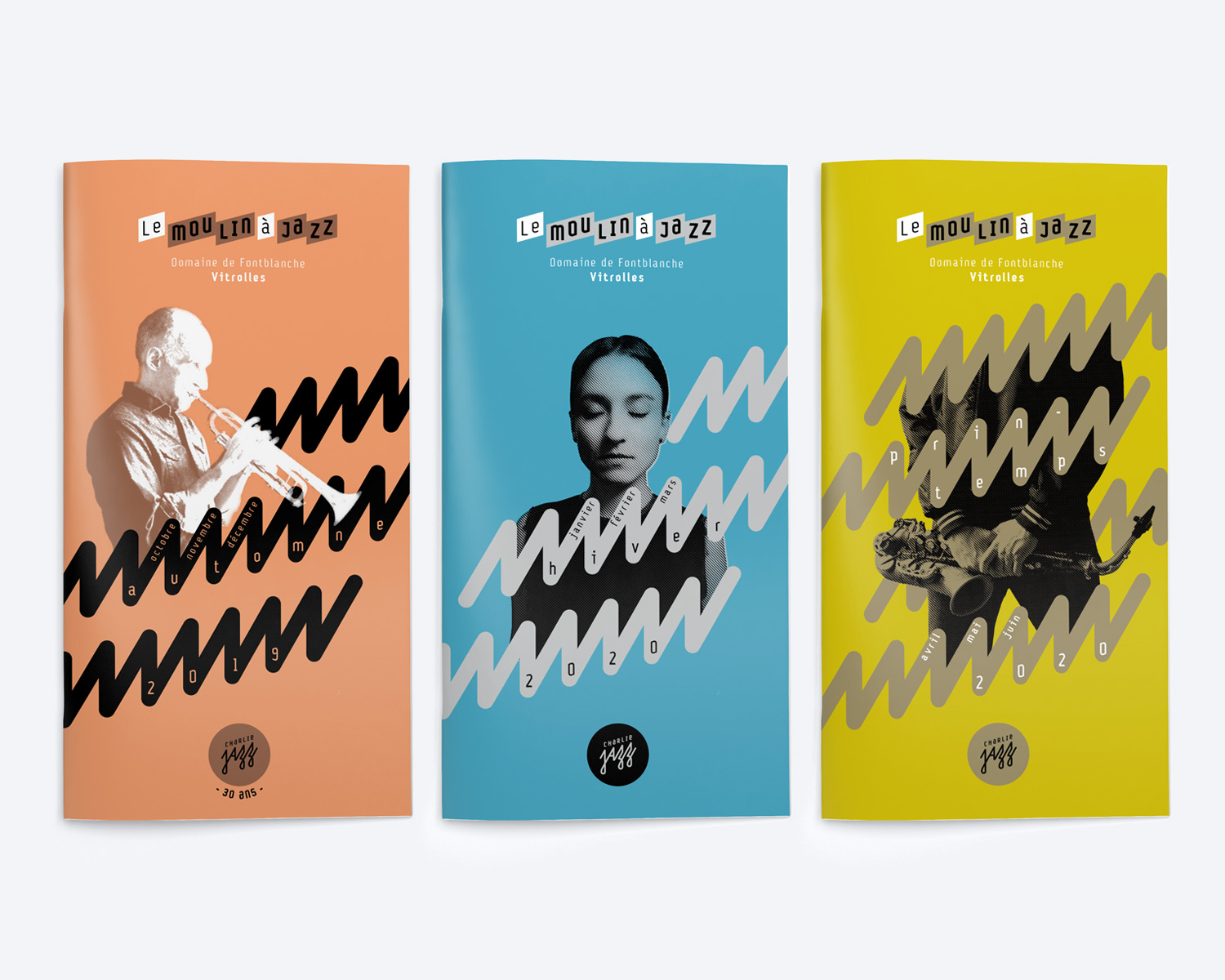 Création de l’identité visuelle de l’association Charlie Jazz dont la ligne artistique favorise un jazz actuel et contemporain et décline ses actions avec des concerts bimensuels au Moulin à Jazz, des ateliers de pratique collective, des partenariats avec les structures culturelles de Vitrolles, et son festival en juillet.