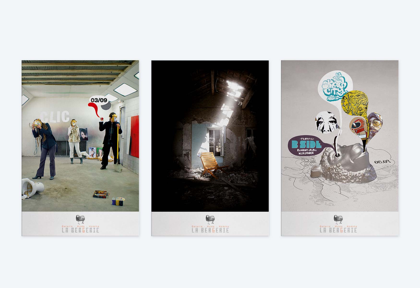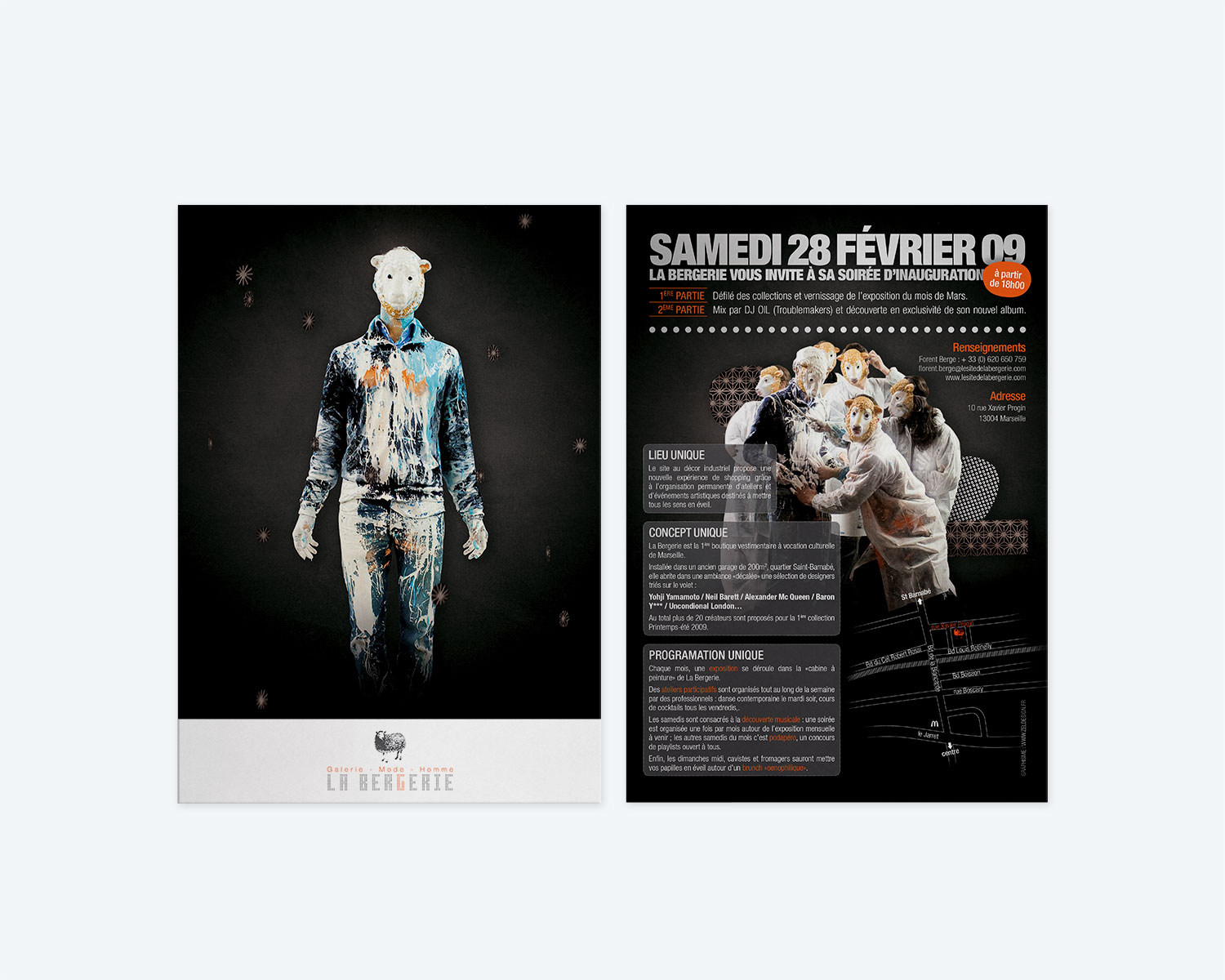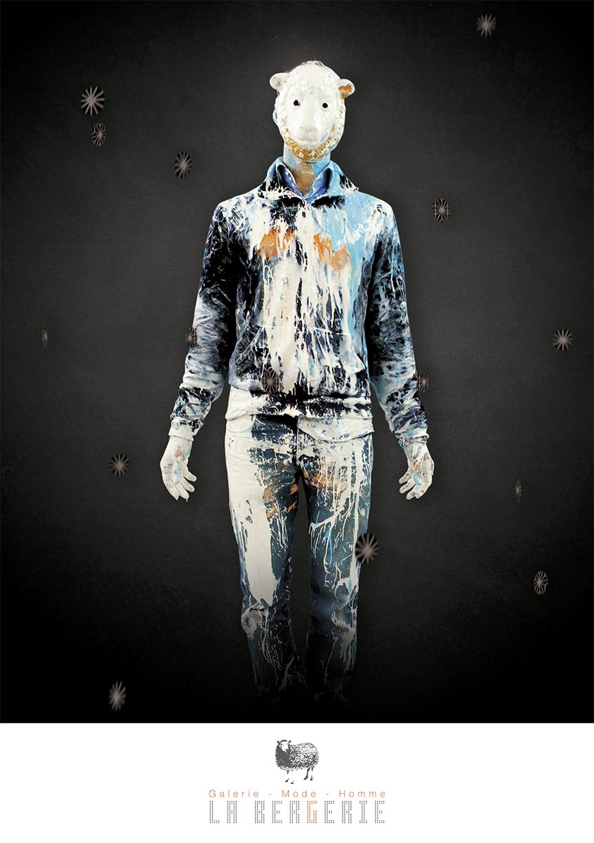 Ma communication s’est naturellement basée sur le masque de mouton pour identifier le lieu (La Bergerie), à la fois représentatif de la mode (comme accessoire) et de l’art (comme objet symbolique).