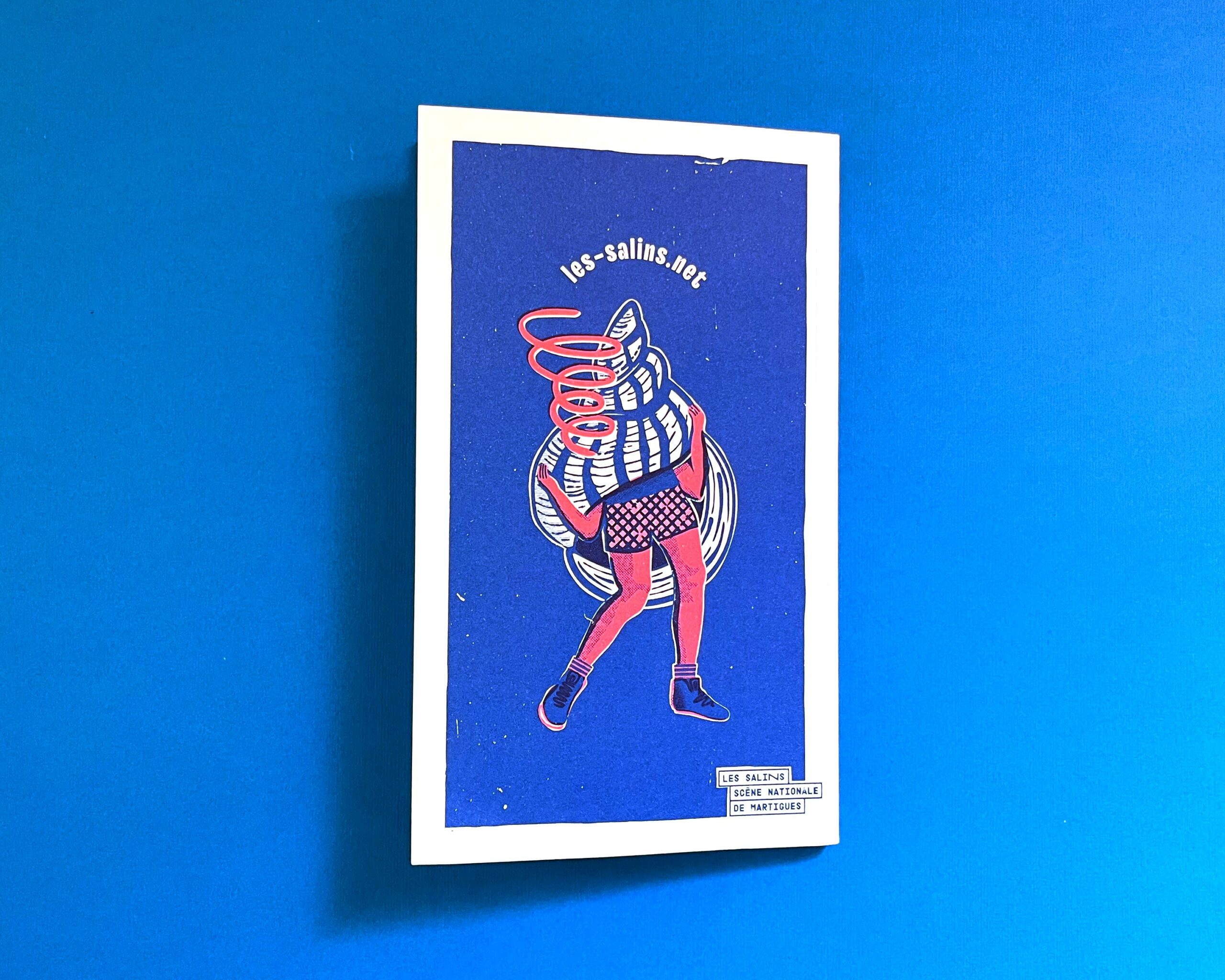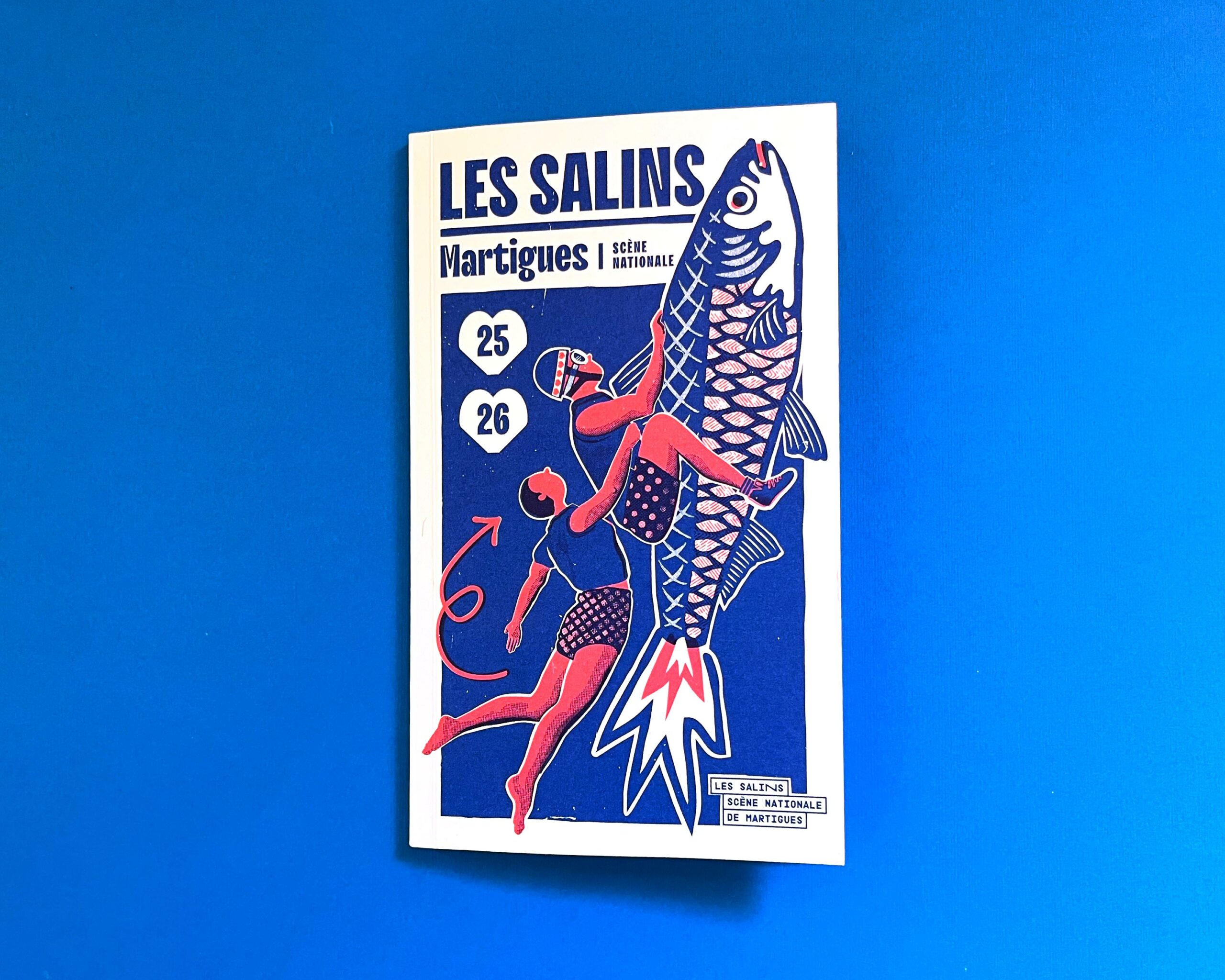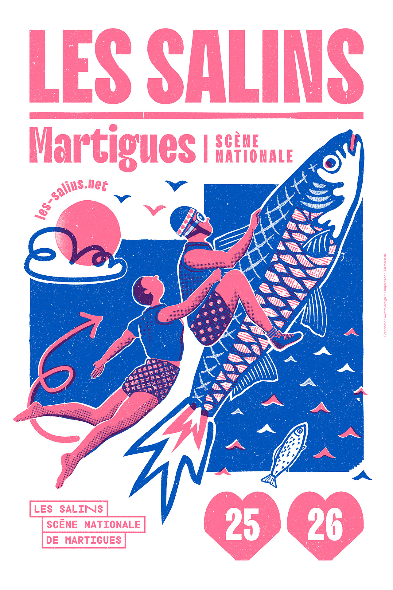Je propose un travail illustratif décalé accès sur l’analogie : sortir de sa coquille (de chez soi, de ses habitudes). J’ai choisi d’utiliser des symboles de la mer pour faire un petit clin d’œil à la position géographique de Martigues en bordure de la Méditerranée. La sardine va me permettre d’amener le mouvement, l’idée de se déplacer, mais aussi de suggérer la notion de voyage et d’ouverture. Le traité est simple et ludique afin de parler au plus grand nombre.