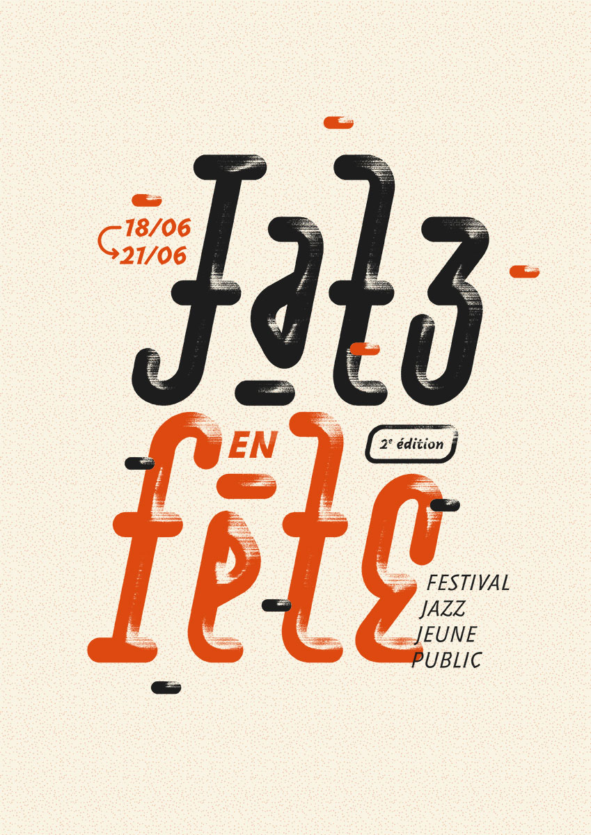 Composition typographique pour un festival jazz jeune publique. L’association Charlie Jazz propose à cette occasion des actions pédagogiques autour du jazz pour des élèves allant de la maternelle au collège. Un temps fort pour clôturer le festival permet de restituer le travail des élèves.