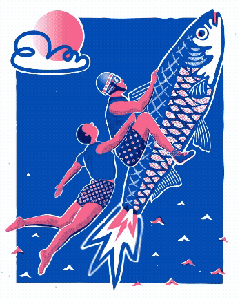 Je propose un travail illustratif décalé accès sur l’analogie : sortir de sa coquille (de chez soi, de ses habitudes). J’ai choisi d’utiliser des symboles de la mer pour faire un petit clin d’œil à la position géographique de Martigues en bordure de la Méditerranée. La sardine va me permettre d’amener le mouvement, l’idée de se déplacer, mais aussi de suggérer la notion de voyage et d’ouverture. Le traité est simple et ludique afin de parler au plus grand nombre.